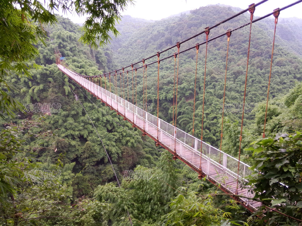 描述:這種木板吊橋,是一種供游人娛樂的橋,它將一人寬的木板栓在鋼索上吊起來,橋的下方是一條35米寬的小河,橋面離水面也就是五十來公分高。