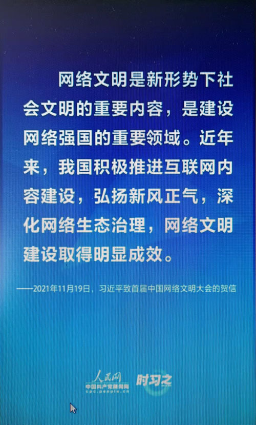 11月19日上午,首屆中國網(wǎng)絡文明大會在京開幕,中共中央總書記、國家主席、中央軍委主席習近平致信祝賀。網(wǎng)絡文明是新形勢下社會文明的重要內容,是建設網(wǎng)絡強國的重要領域。習近平總書記高度重視網(wǎng)絡生態(tài)治理,強調要培育積極健康、向上向善的網(wǎng)絡文化。
